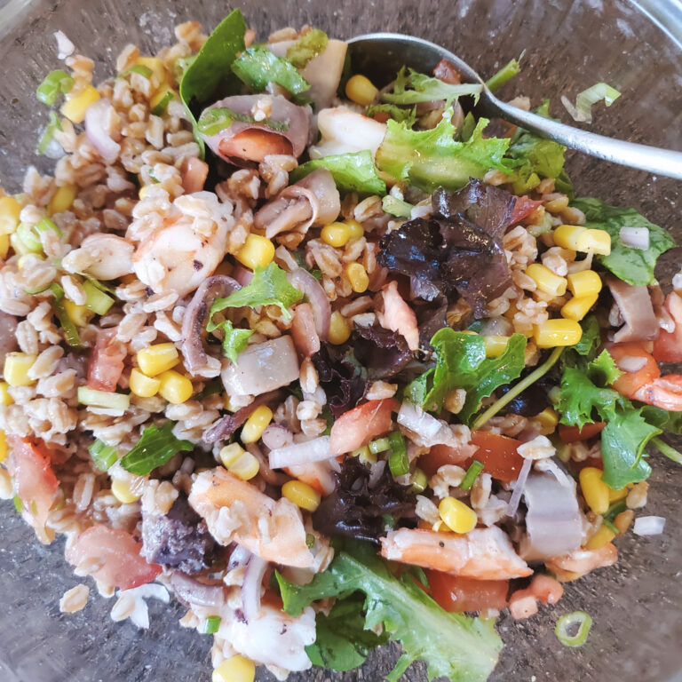It can be awkward opening up a can of seafood and eating it plain by itself, especially for a can of small squids that are packed whole with the head, tentacles, guts and all. The flavor can be overwhelming too, so it’s easier to enjoy cut up and put into a dish containing brighter flavors, such as this farro salad with shrimp, tomatoes and other veggies. Everything cut up into bite size makes it easy to eat and to have on hand. Farro also keeps well as it doesn’t get soggy nor hard kept in the fridge for a couple days.